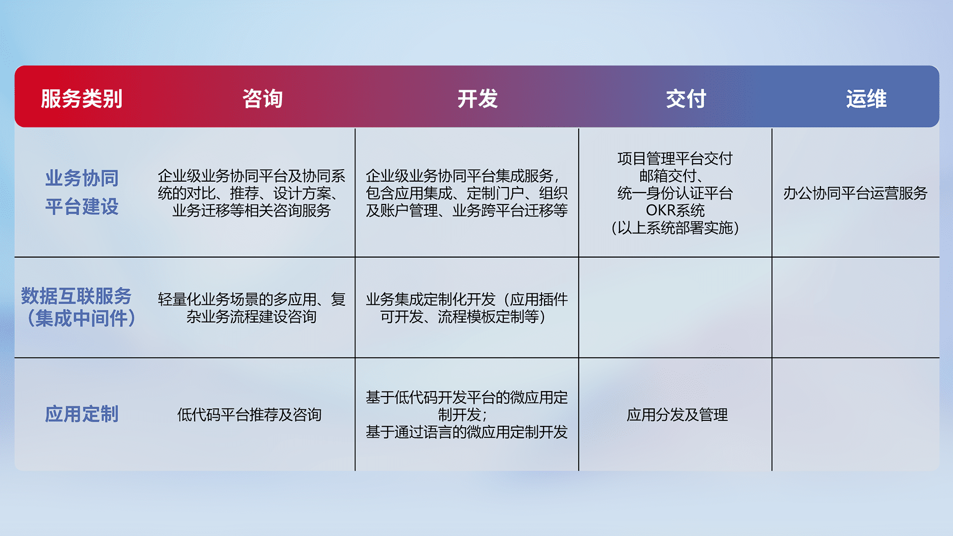 针对钉钉、、、企微、、IDaas等平台级产品提供产品的规划、、、方案、、、交付、、、定制化开发等服务,,实现如统一协同办公、、智能客户服务、、混合会议管理、、智能数据查询、、、、等业务场景,,,,实现数字化转型。。